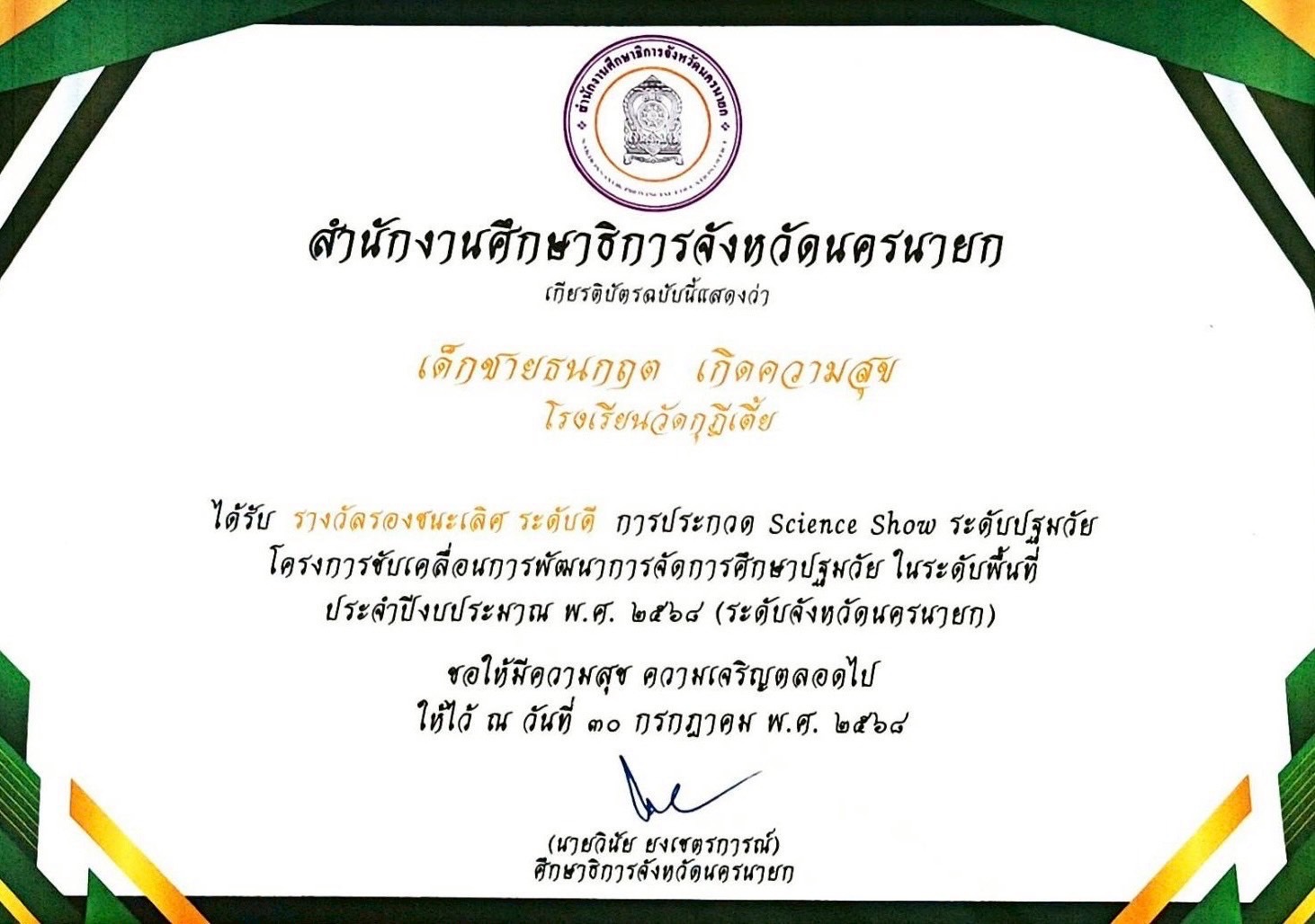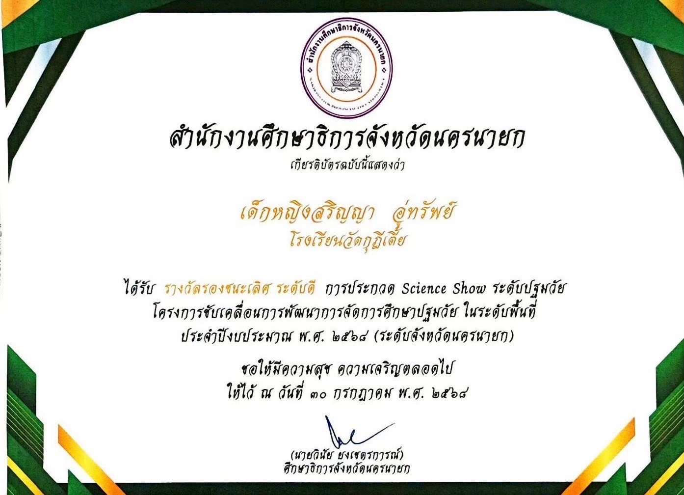 ชื่อผลงาน : ได้รับรางวัล รองชนะเลิศ ระดับดี การประกวด Science Show ระดับปฐมวัย โครงการขับเคลื่อนการพัฒนาการจัดการศึกษาปฐมวัย ในระดับพื้นที่ ประจำปีงบประมาณ พ.ศ. 2568 (ระดับจังหวัดนครนายก)