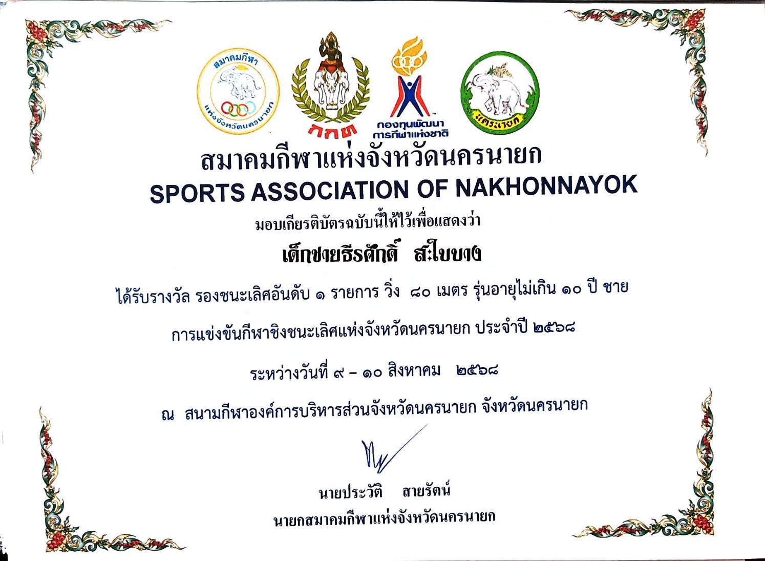 รางวัลรองชนะเลิศอันดับ 1 รายการวิ่ง 80 เมตร รุ่นอายุไม่เกิน 10 ปี ชาย การแข่งขันกีฬาชองชนะเลิศแห่งจังหวัดนครนายก ประจำปี 2568