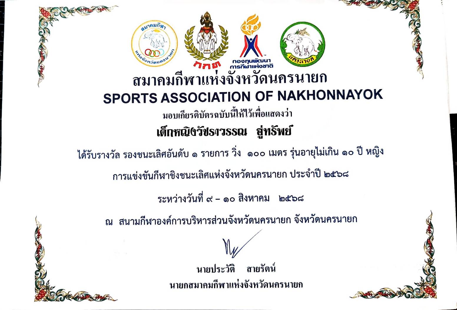 รางวัลรองชนะเลิศ ดันดับ 1 รายการวิ่ง 100 เมตร รุ่นอายุไม่เกิน 10 ปีหญิง การแข่งขันกีฬาชองชนะเลิศแห่งจังหวัดนครนายก ประจำปี 2568