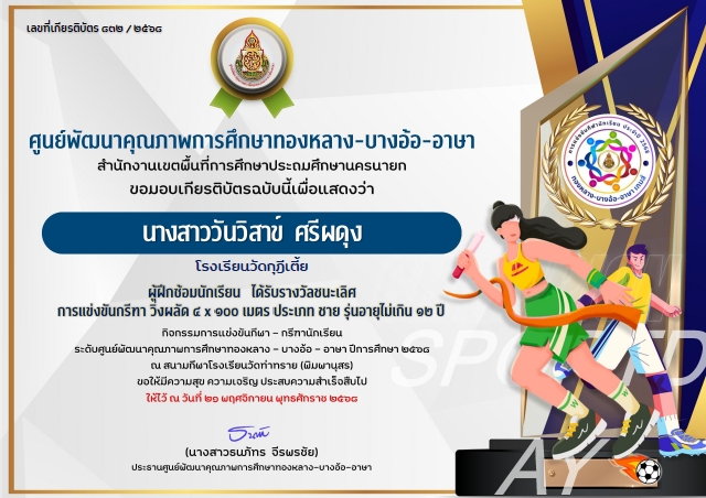 ผู้ฝึกซ้อมนักเรียน ได้รับรางวัลรองชนะเลิศอันดับที่ 1 การแข่งขันกรีฑา วิ่งผลัด4x100 เมตร ประเภท หญิง รุ่นอายุไม่เกิน 10 ปี กิจกรรมการแข่งขันกีฬา-กรีฑานักเรียน ระดับศูนย์พัฒนาคุณภาพการศึกษาทองหลาง-บางอ้อ-อาษา ปีการศึกษา 2568 |