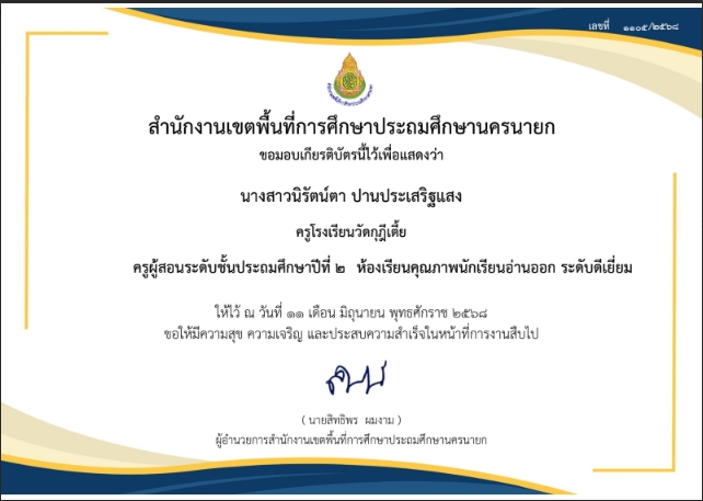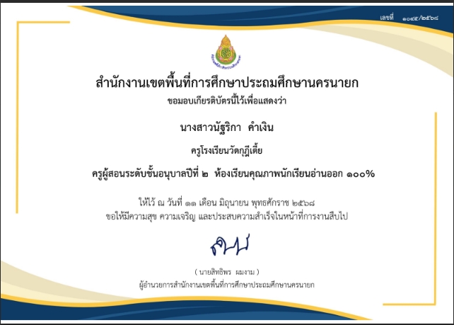 เกียรติบัตรจากการประกวด Poster Presentation Learning Stories หัวข้อ การนำ Loose parts และ Social Emotional Learning ไปใช้ในการเรียนการสอนระดับปฐมวัย จากสำนักงานศึกษาธิการภาค 9 ณ โรงแรมสัปปายะ จ.ฉะเชิงเทรา |