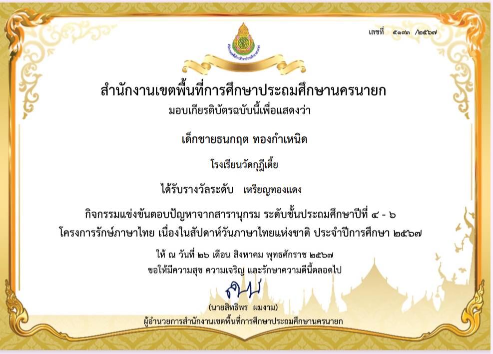 รางวัลระดับเหรียญทองแดง กิจกรรมแข่งขันตอบปัญหาสารานุกรม ระดับชั้นประถมศึกษาปีที่ 4-6
