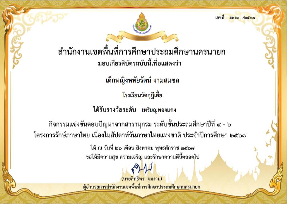 รางวัลระดับเหรียญทองแดง กิจกรรมแข่งขันตอบปัญหาสารานุกรม ระดับชั้นประถมศึกษาปีที่ 4-6