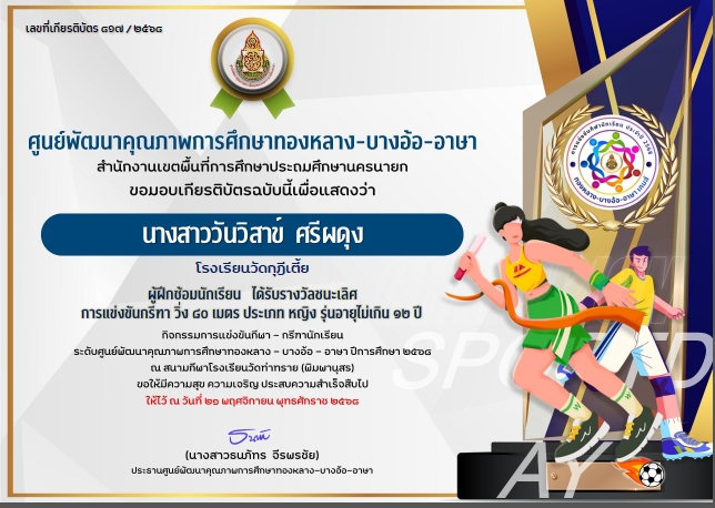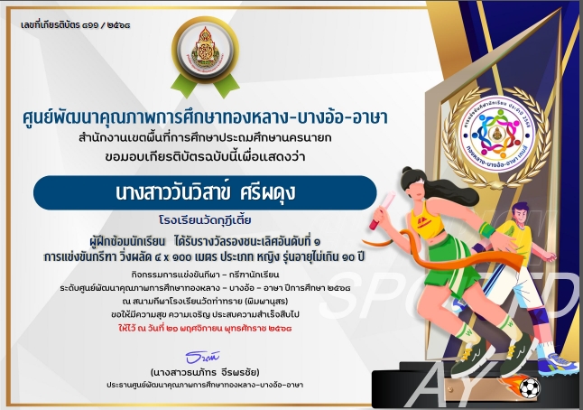 ผู้ฝึกซ้อมนักเรียน ได้รับรางวัลรองชนะเลิศอันดับที่ 1 การแข่งขันกรีฑา วิ่งผลัด4x100 เมตร ประเภท หญิง รุ่นอายุไม่เกิน 10 ปี กิจกรรมการแข่งขันกีฬา-กรีฑานักเรียน ระดับศูนย์พัฒนาคุณภาพการศึกษาทองหลาง-บางอ้อ-อาษา ปีการศึกษา 2568 |