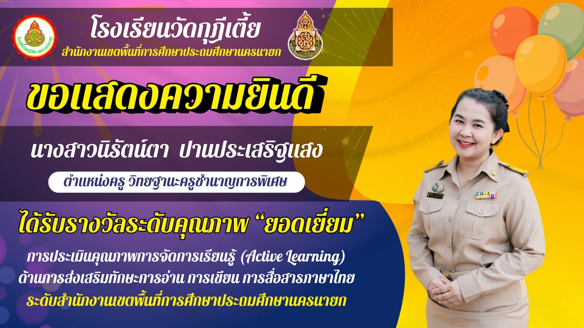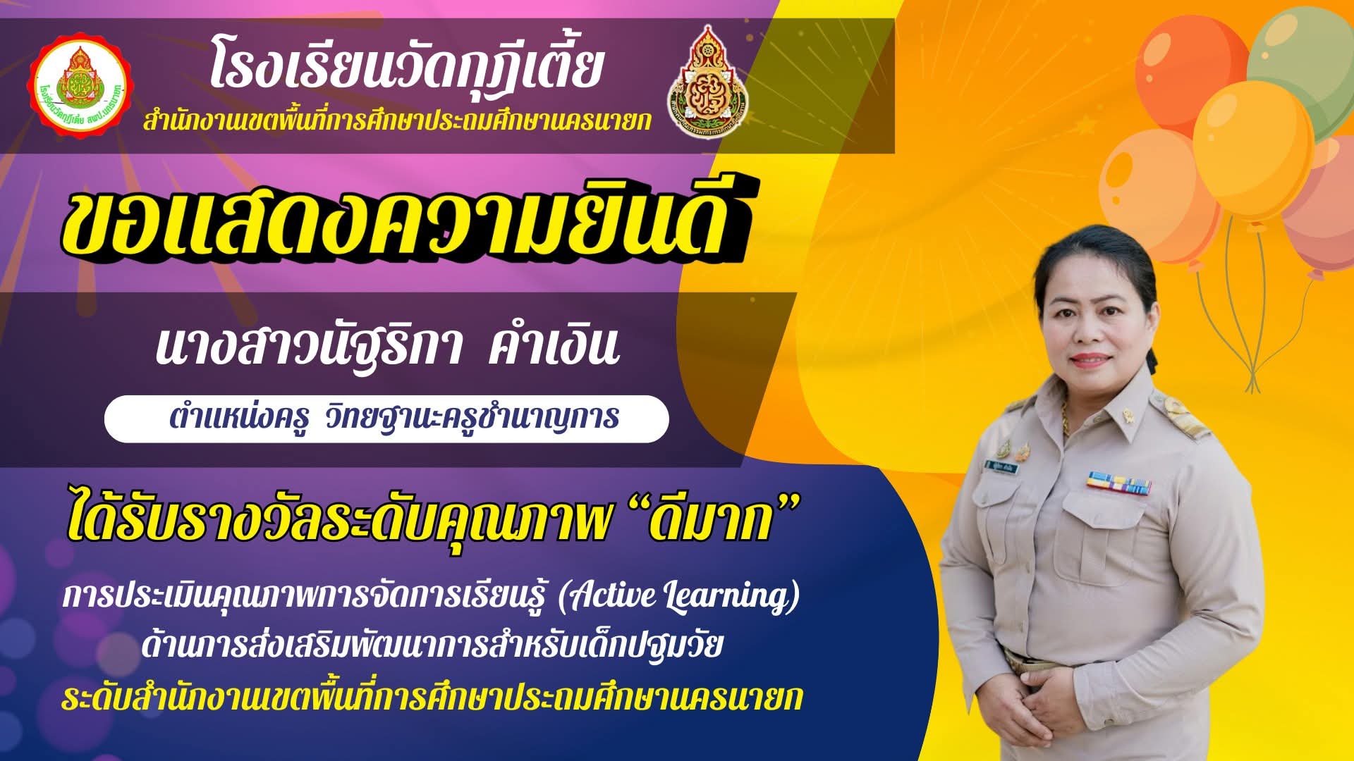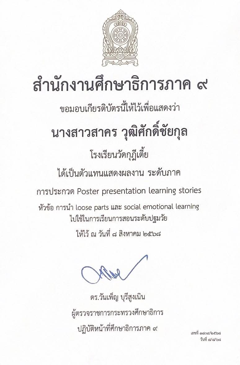 เกียรติบัตรจากการประกวด Poster Presentation Learning Stories หัวข้อ การนำ Loose parts และ Social Emotional Learning ไปใช้ในการเรียนการสอนระดับปฐมวัย จากสำนักงานศึกษาธิการภาค 9 ณ โรงแรมสัปปายะ จ.ฉะเชิงเทรา |